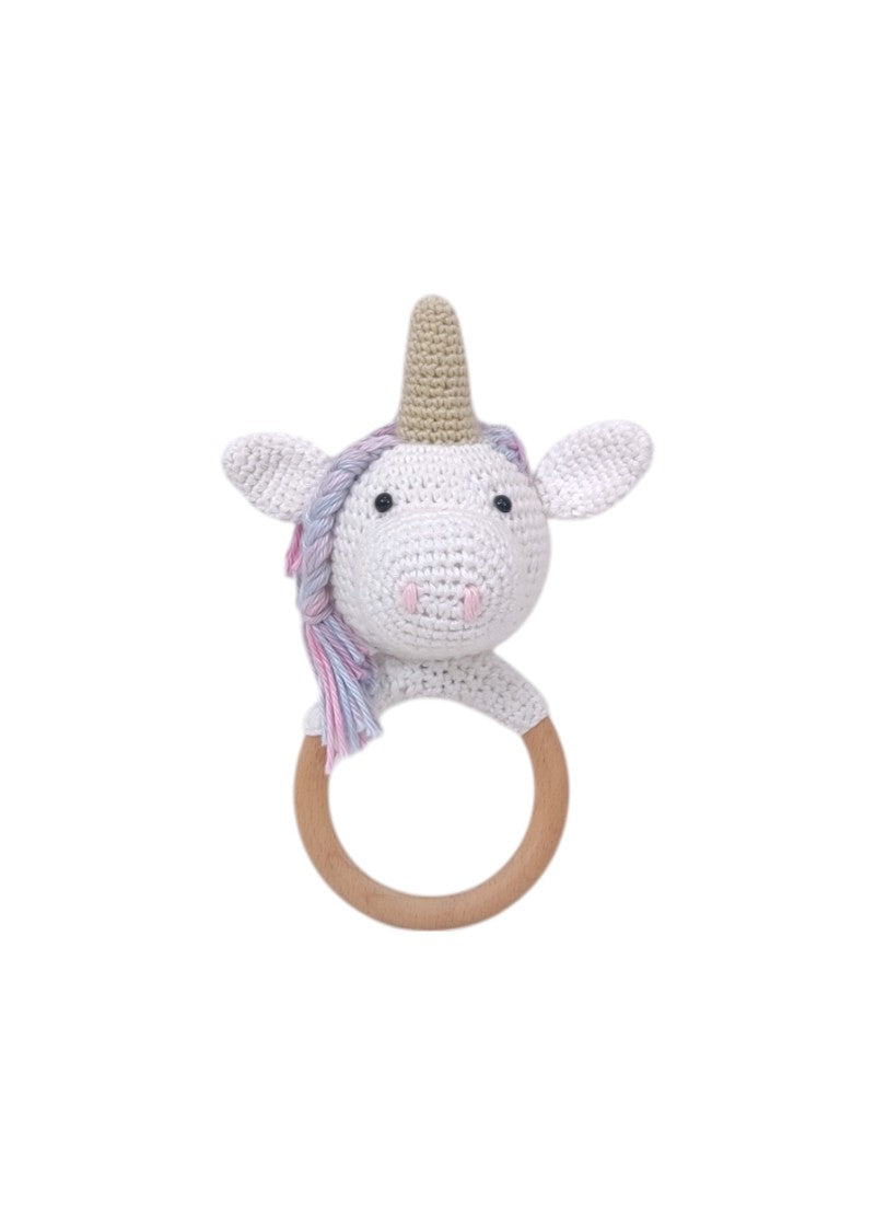 Handcrafted with love, this mythical friend features a soft white body, pastel mane, a golden horn and a smooth wooden ring — perfect for tiny hands to grasp and shake