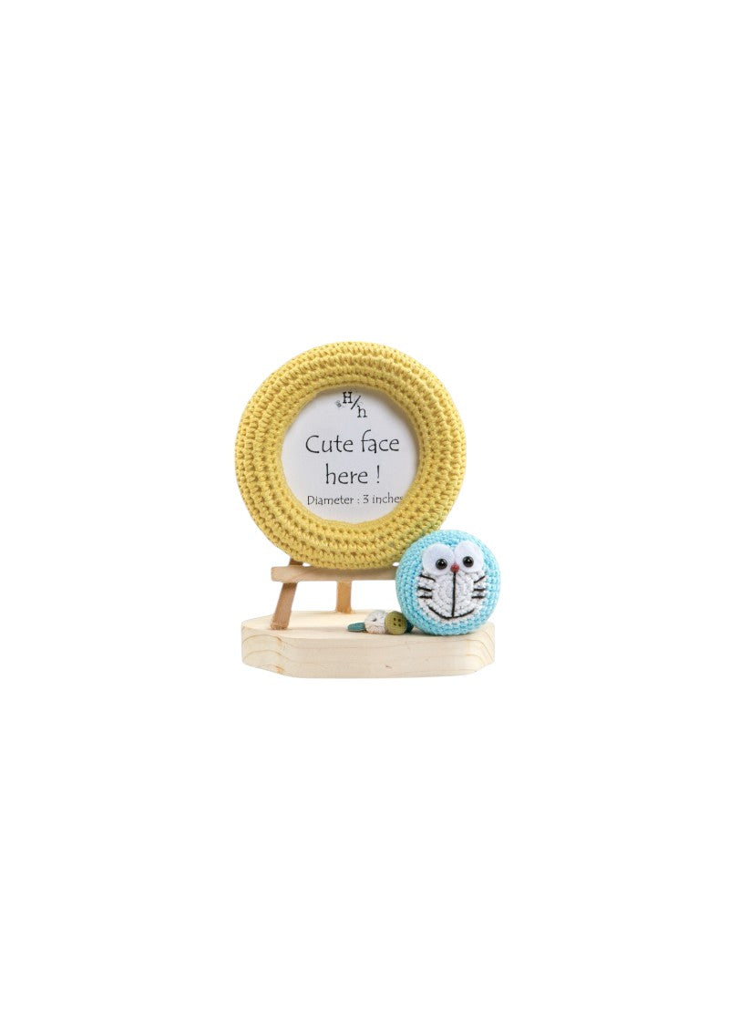 "Celebrate your love for the iconic robotic cat with this adorable Doraemon-inspired crochet photo frame!