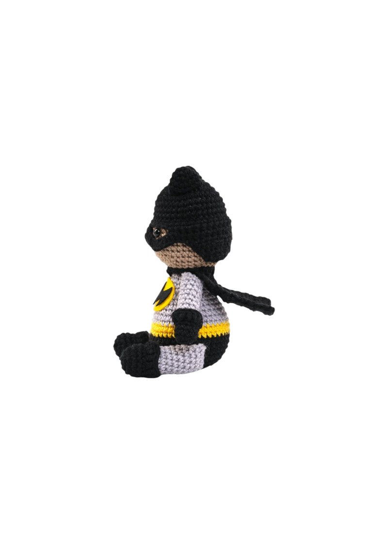 Hand-crocheted with love and care, this brave little hero is suited up in his classic black and grey outfit, complete with the iconic bat emblem. With his tiny mask, pointy ears, and fearless spirit, he’s ready to watch over your little one’s adventures — day or night!