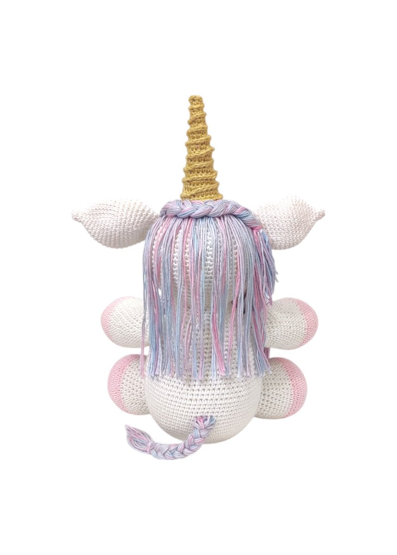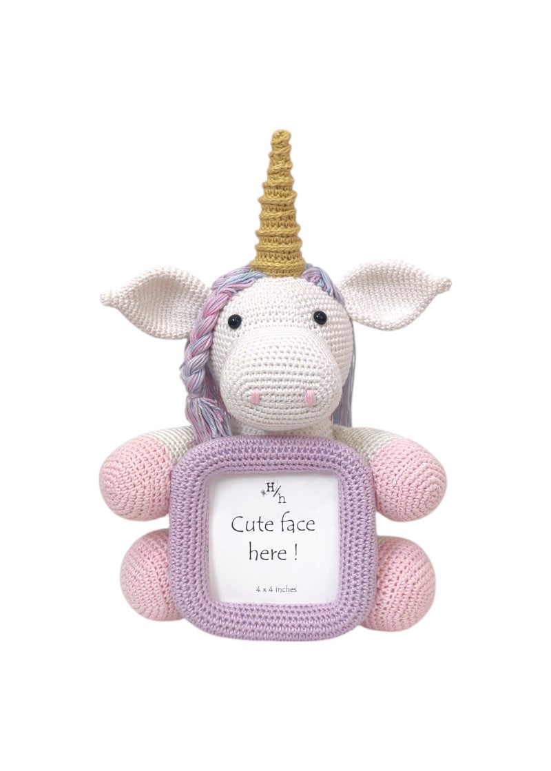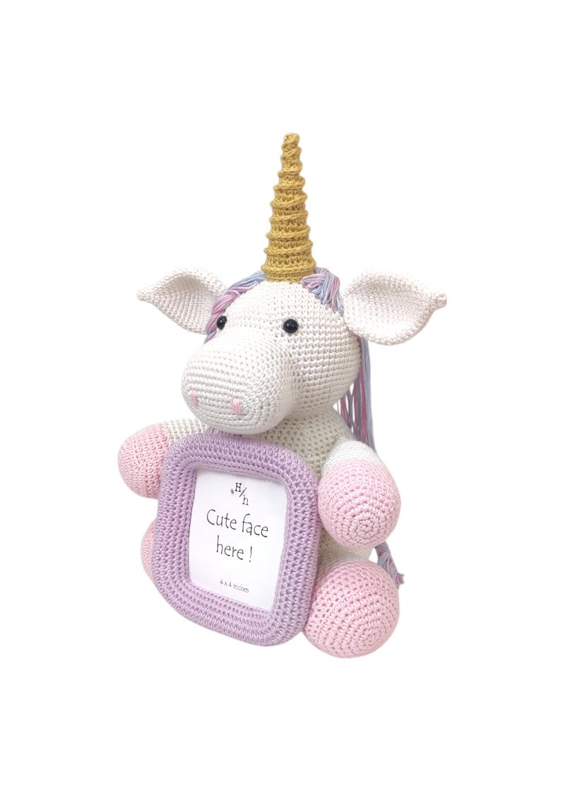 "Capture memories with a touch of magic! This beastly toy frame brings fairy tales to life with its dreamy design and exquisite craftsmanship. Lovingly crocheted with soft pastel yarns, this enchanting unicorn features a golden horn, braided and shaded mane, and cuddly hooves wrapped around a 4 x 4 inch soft lavender photo frame