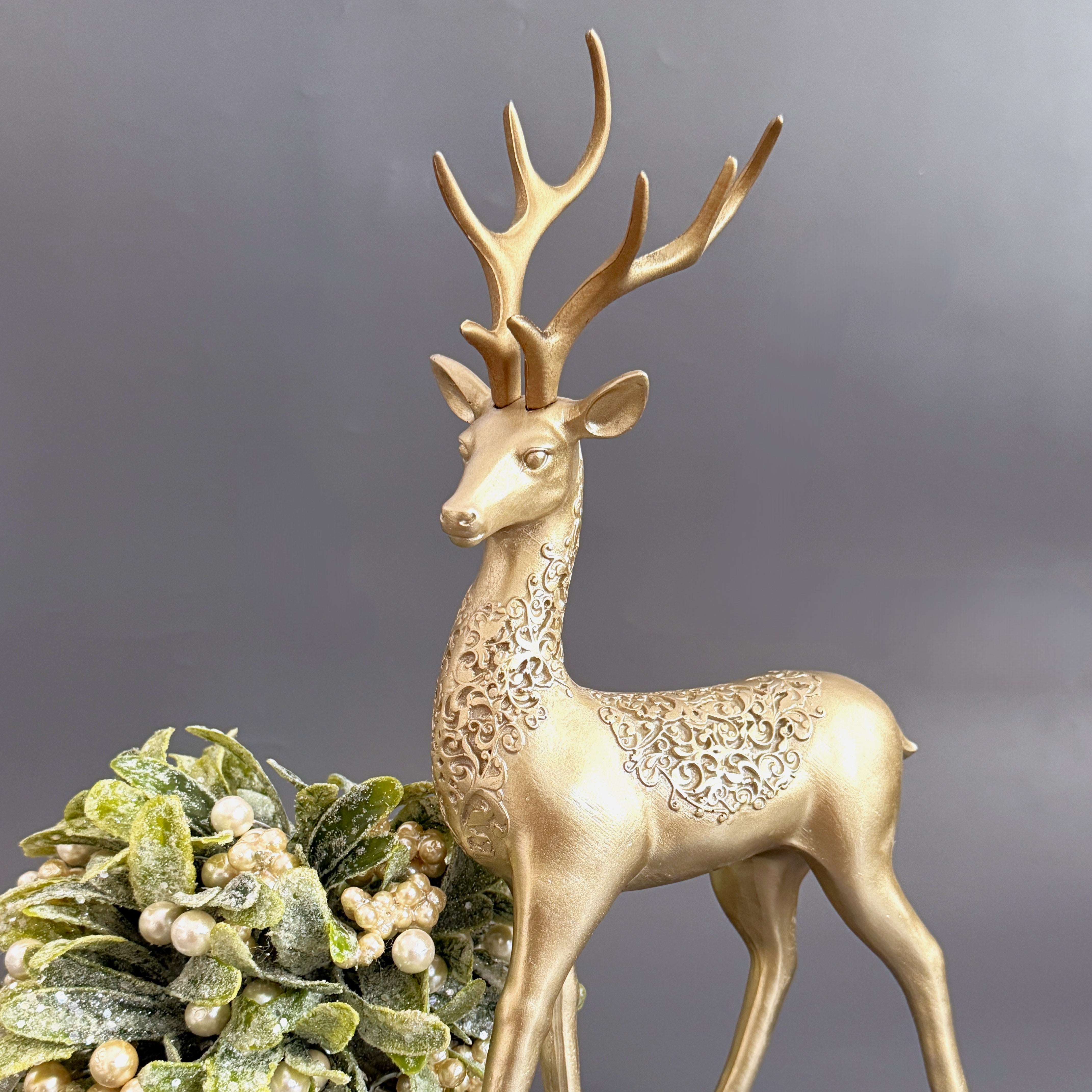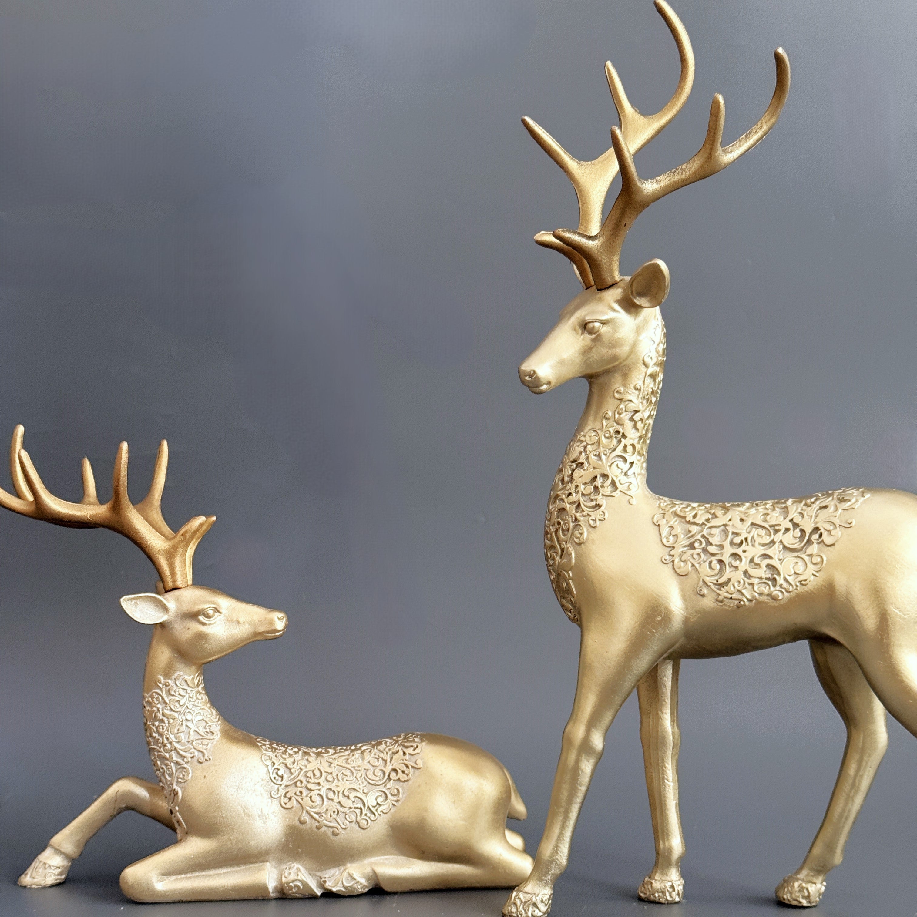 A standing and sitting gold reindeer figurine, crafted with fine details, perfect for creating a regal and serene holiday atmosphere.