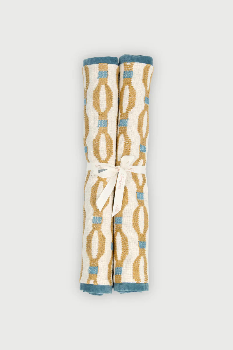 "Our Poppy Ochre Embroidered Cotton Slub Table Mat – Set of 2 is crafted from natural cotton slub with a smooth flat weave, featuring delicate ogee-shaped embroidery that adds a subtle charm to your table setting.