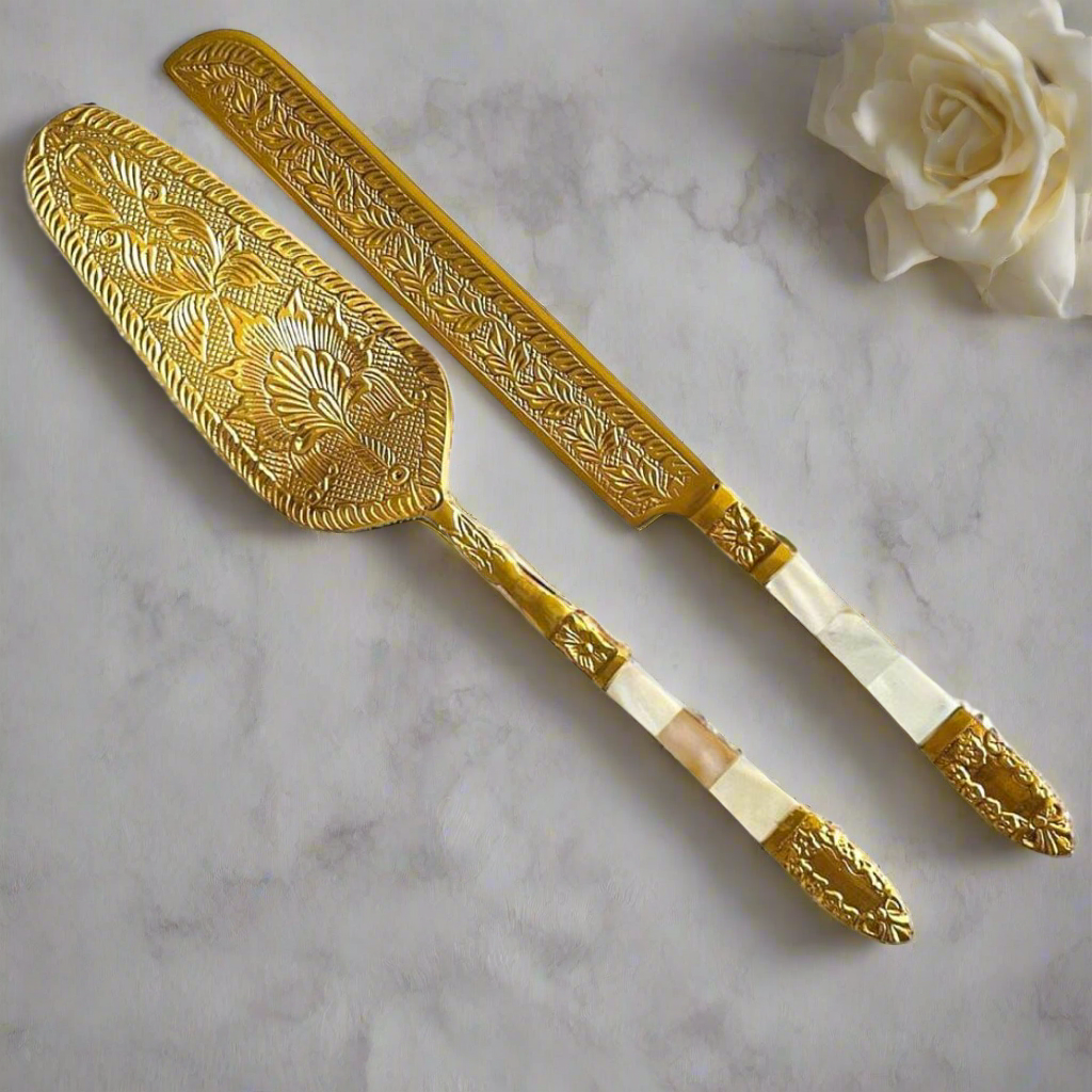 Add a dash of grandeur to your celebrations with an exquisitely crafted cake knife and server set that’s truly a showstopper. Featuring intricate floral engravings in a brilliant antique gold finish, this pair is adorned with delicate pearl-toned handles that offer both elegance and grip