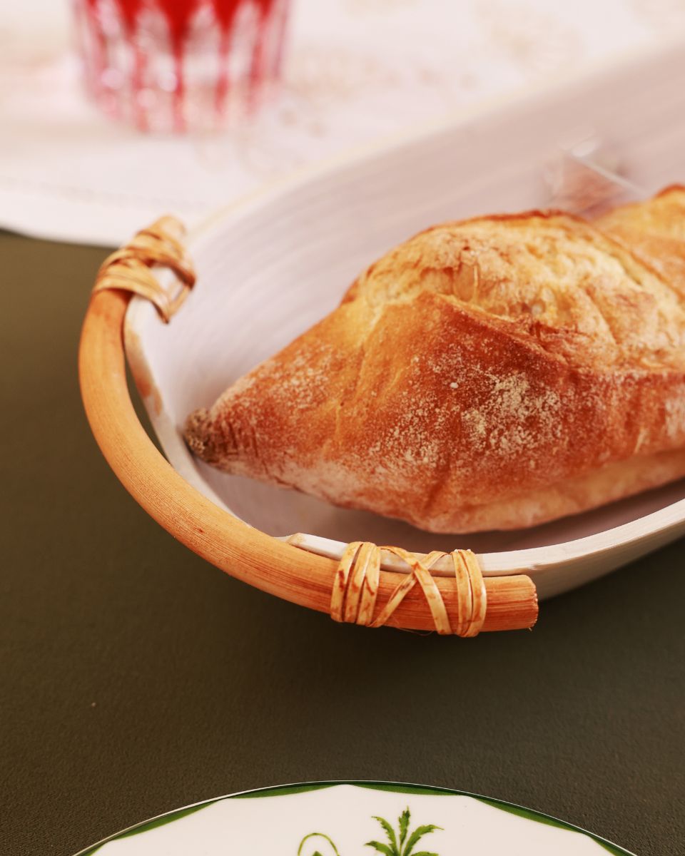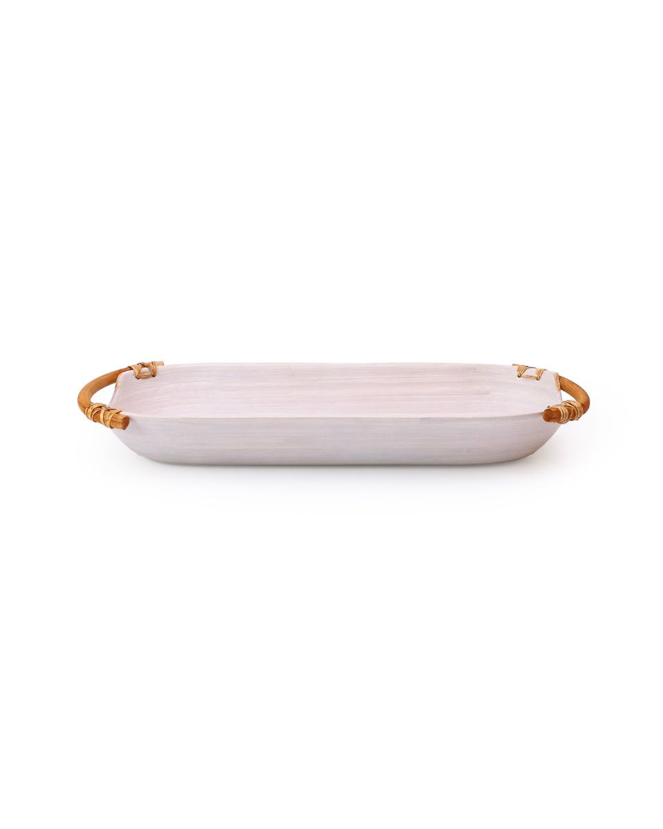 Serve your favorite breads, fruits, and snacks on the exquisite long bamboo platter. Crafted from spun bamboo and featuring stylish rattan handles, this platter combines functionality with natural beauty.