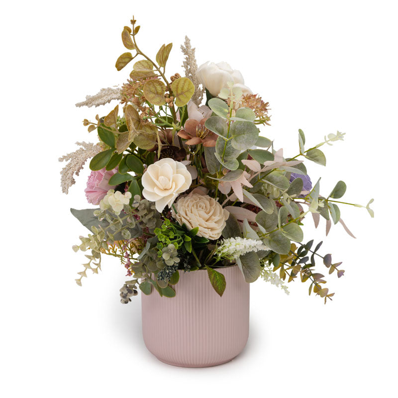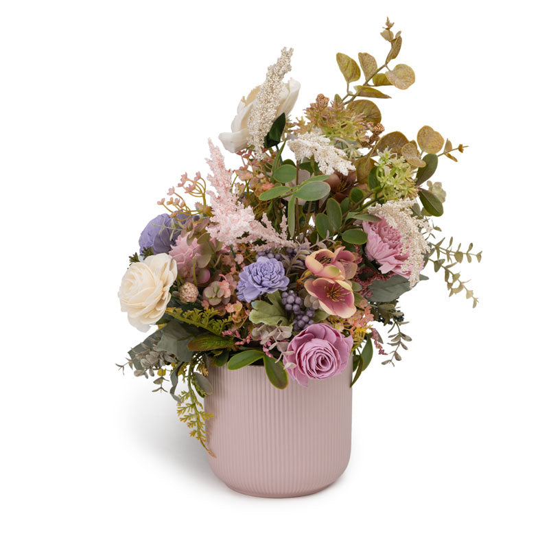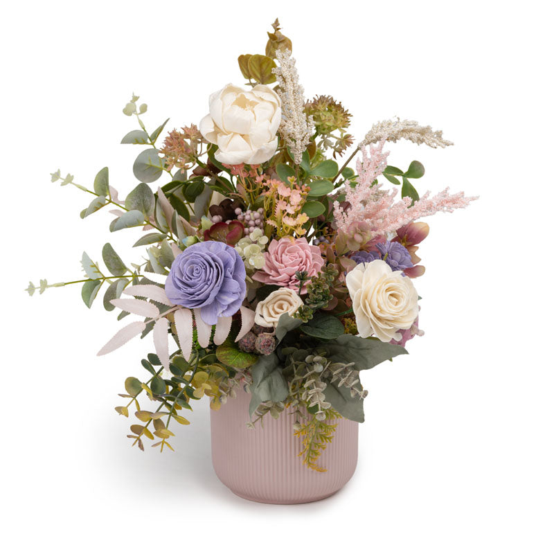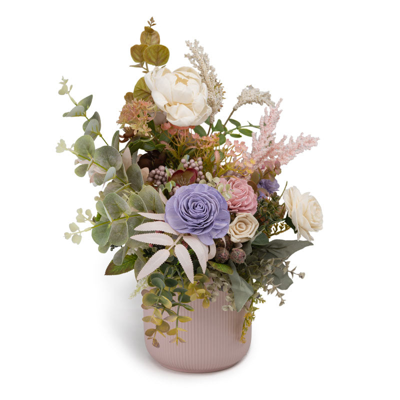 This Sola Wood arrangement, named "Blooming Ikea," features an elegant and vibrant mix of handcrafted wooden flowers. The arrangement includes delicate pastel shades of lavender, blush pink, and cream, complemented by soft greenery. The flowers are artfully arranged in a stylish, ribbed mauve pot, making it a perfect decorative piece for any room. The combination of different textures and colors adds a touch of sophistication and natural beauty, ideal for those looking for a long-lasting, maintenance-free floral display. Size