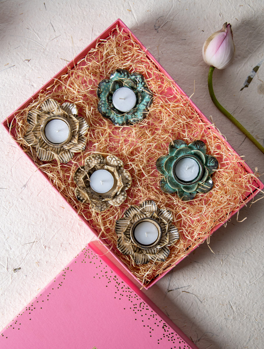 Includes: 5 ceramic flower tea light holders & 5 tea lights in a gift box