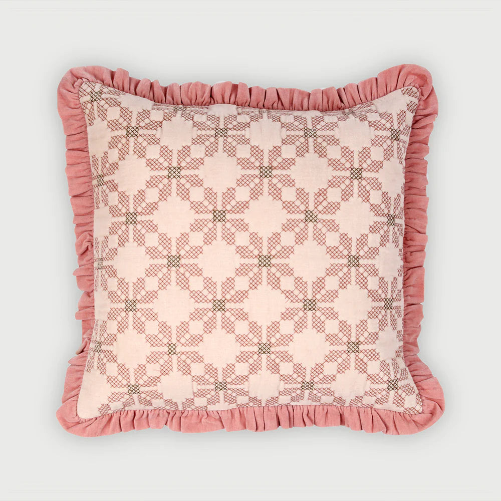 "Our Daisy Baby Pink Embroidered Velvet Cushion Cover is crafted from luxurious cotton microvelvet featuring delicate cross-stitch embroidery.