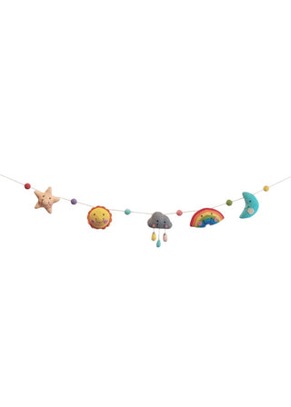 A dreamy decorative garland that captures the magic of the heavens. Featuring an adorable lineup of handcrafted characters including a smiling star, cheerful sun, drizzly cloud, vibrant rainbow, and a sleepy crescent moon, this whimsical bunting is perfect for nurseries playrooms, or anywhere that could use a little extra joy