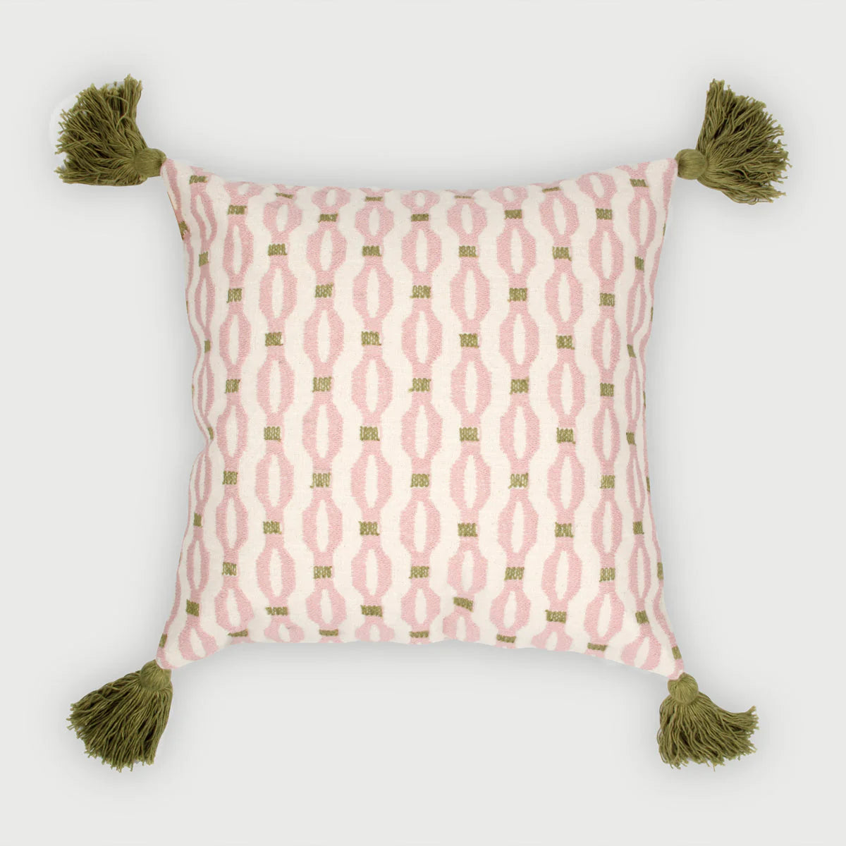 "Our Poppy Soft Pink Embroidered Cotton Slub Cushion Cover is crafted from natural cotton slub in a simple flat weave, featuring elegant ogee-shaped embroidery.